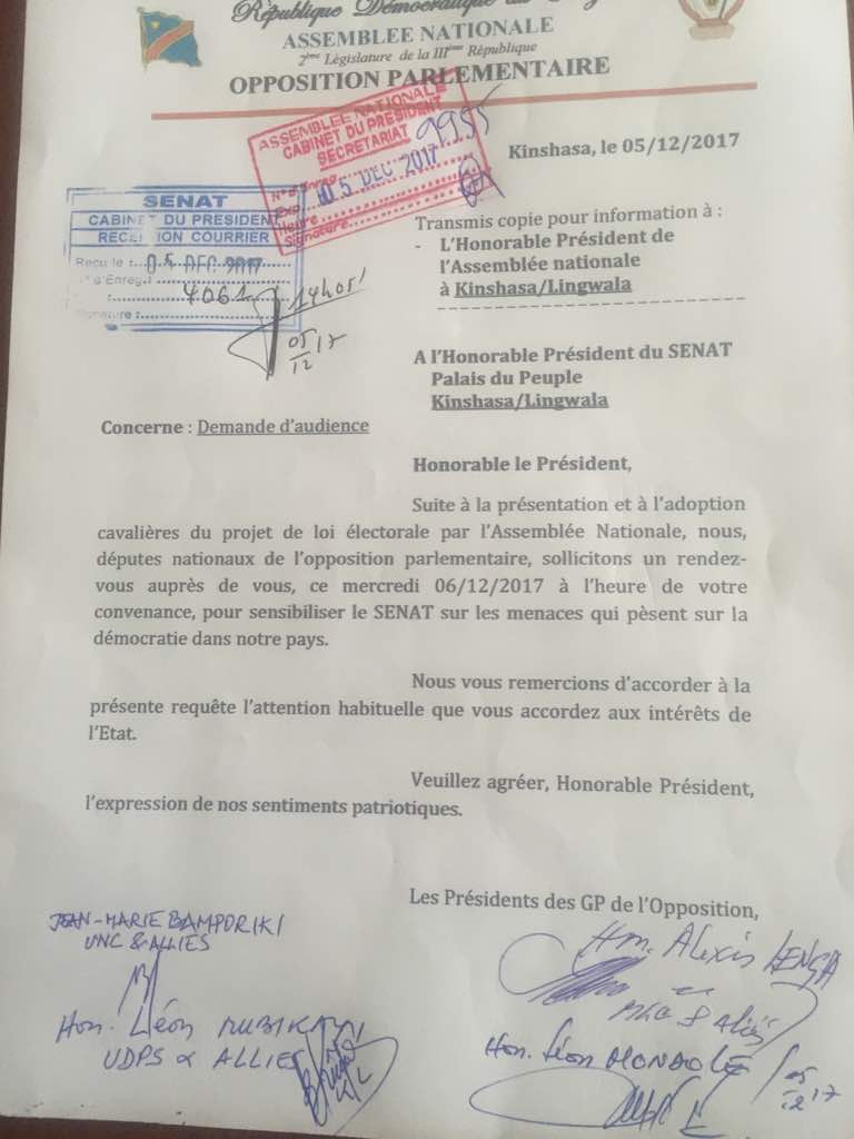 #RDC Un mémo a été remis au Président du Sénat par l'opposition qui a boycotté le vote de la loi électorale.